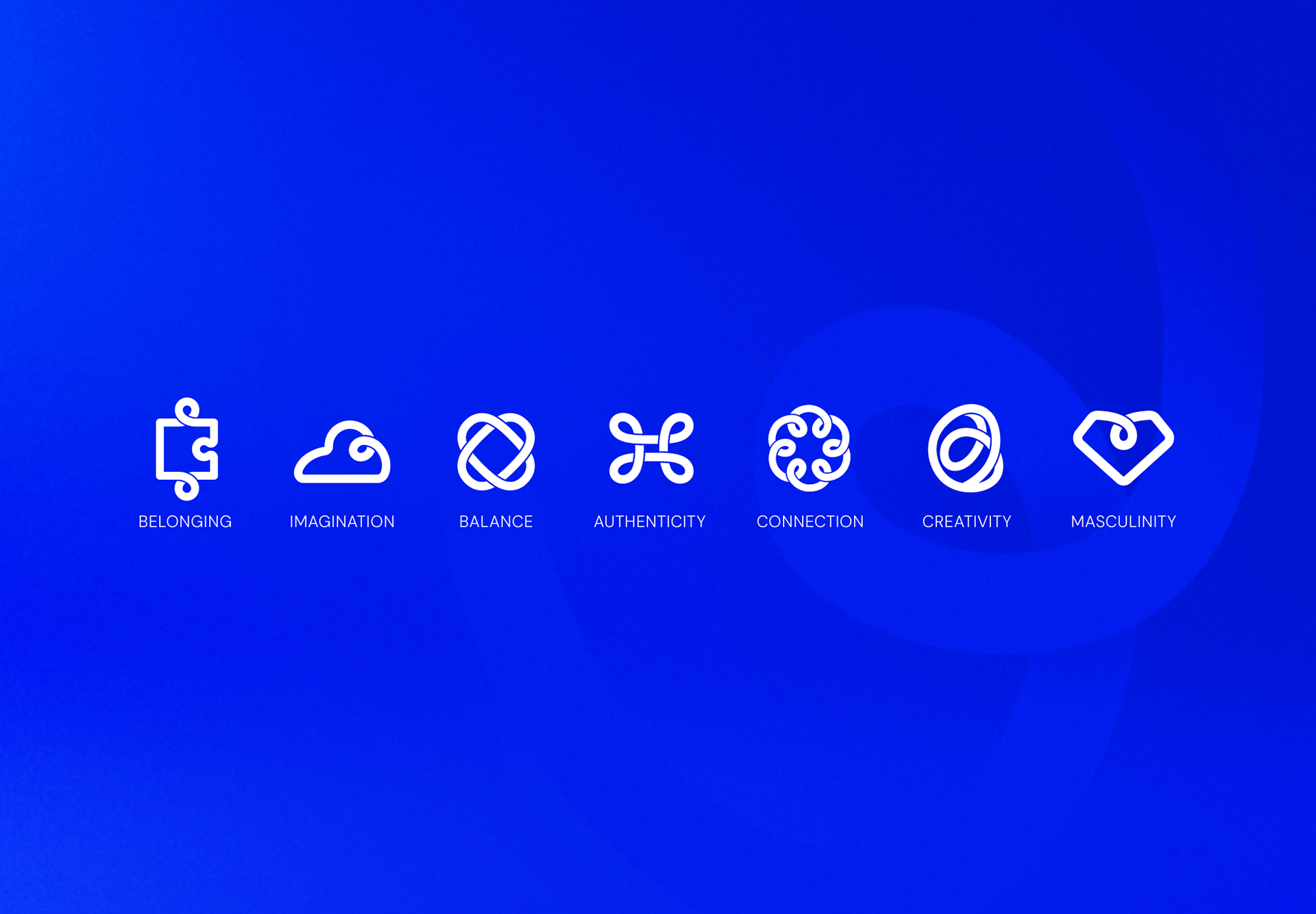 The logo influenced icons that depict Fellow Psychology’s seven values: belonging, imagination, balance, authenticity, connection, creativity, and masculinity. Those that represent belonging, imagination, and balance resemble familiar symbols associated with those words. To create the icons for authenticity, connection, and creativity, I drew upon more lateral imagery. For a bit of fun, emblems worn by superheroes inspired the design for masculinity.