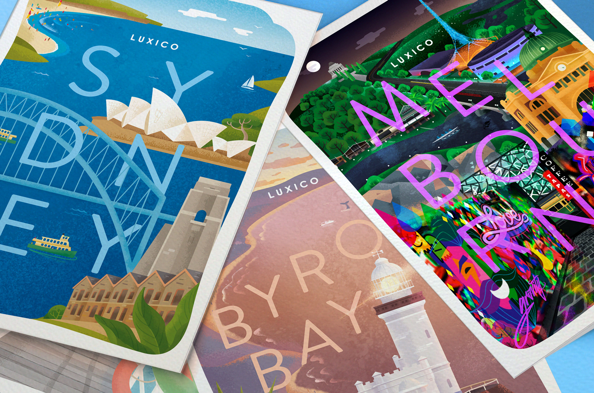 I was commissioned by Luxico, Australia's premier ‘home hotel’ platform managing luxury villas and homes, to illustrate six of their best property locations. Sydney and Melbourne were on top of their list, as well as popular beachside destinations Palm Beach, Mornington Peninsula, Gold Coast and Byron Bay.
